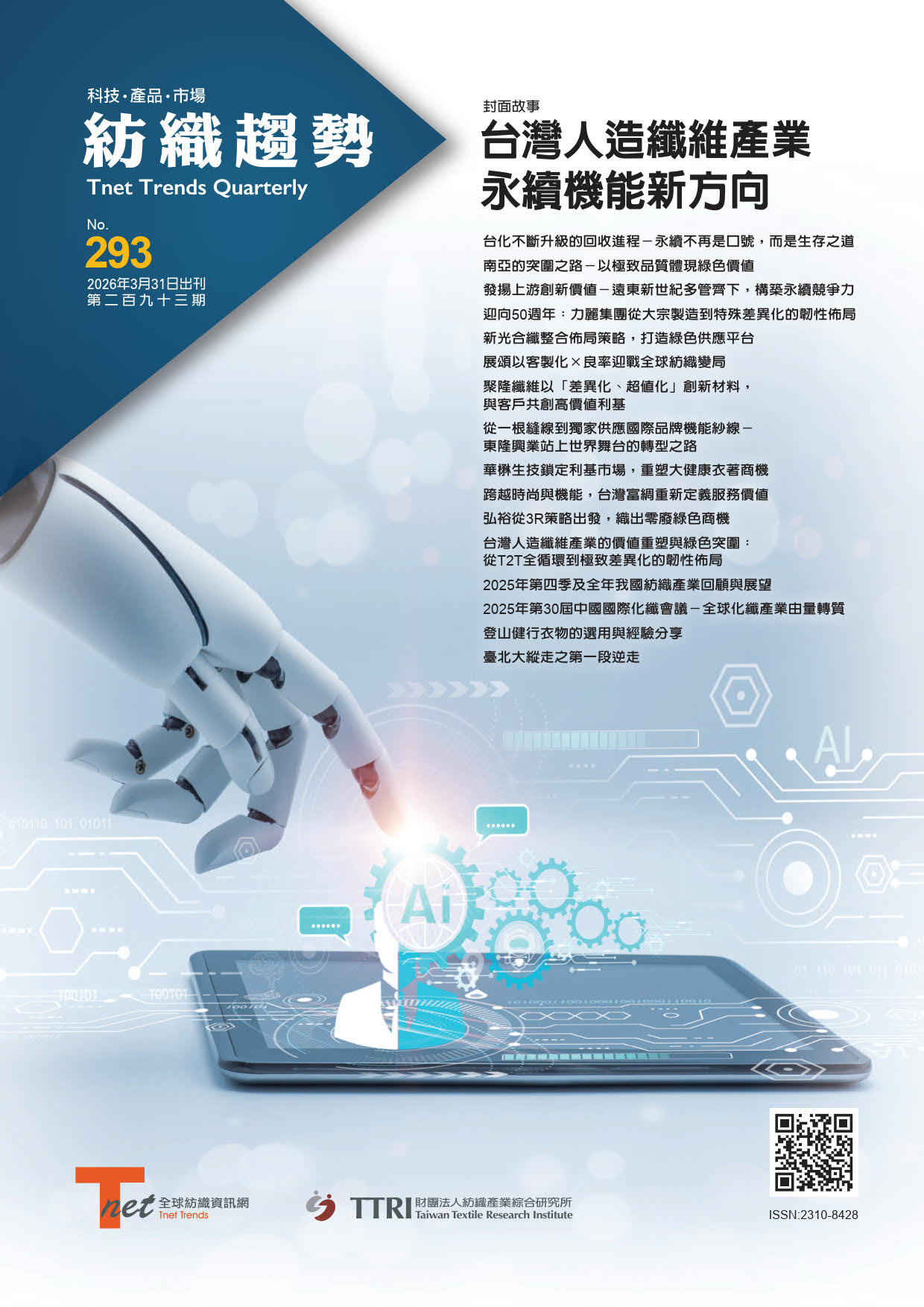 時光荏苒,已到2024年中,世界各國不論是自 然或是政經環境,都是一日數變,而數位化、環保、新技術、滿足客戶個別需求,是許多產業致力發展的目標,亦是台灣紡織產業的轉型重點,透過各種包含AI在內的新研發技術與異業合作,重整紡織產業鏈。